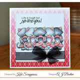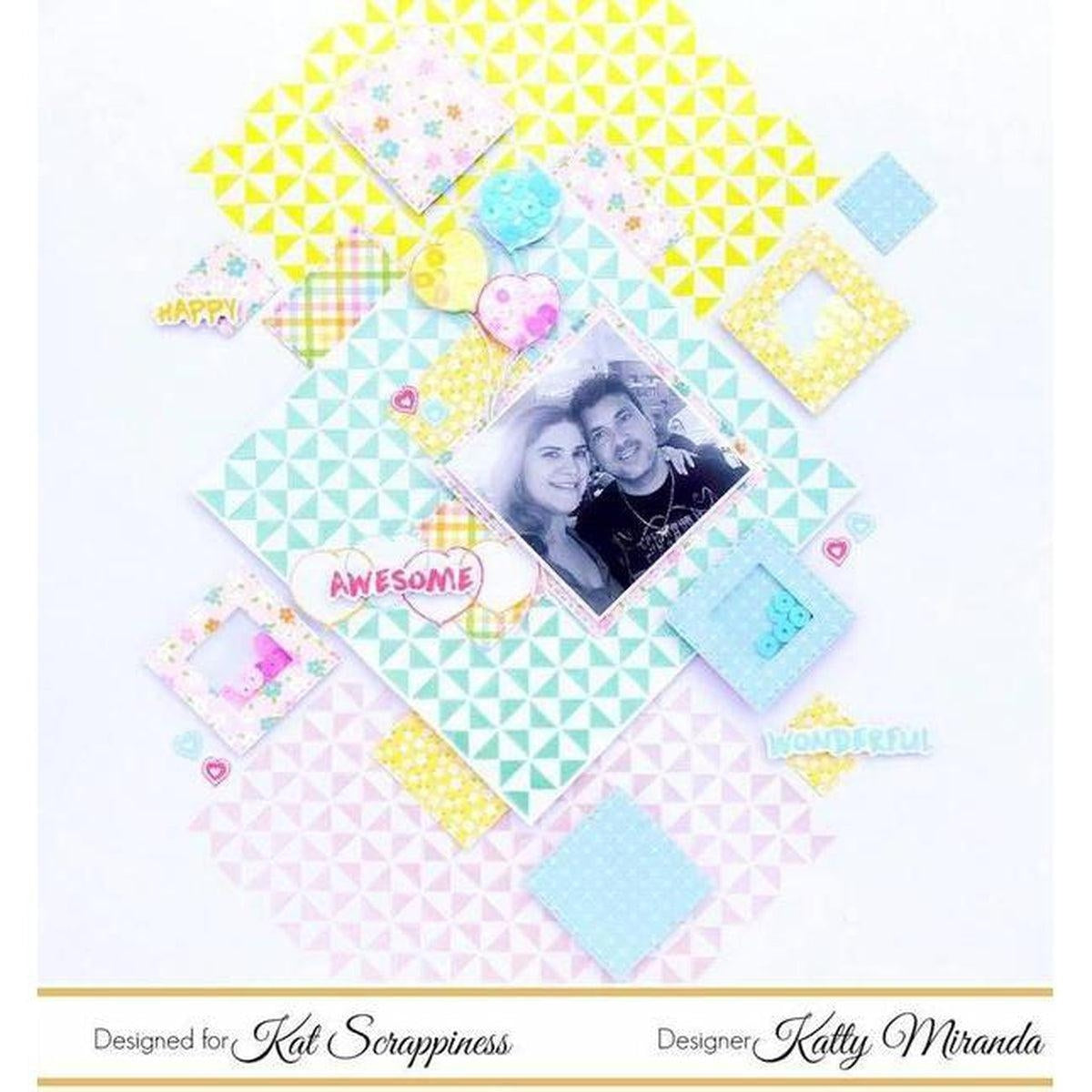 Kat Scrappiness Dies are made of superior steel and are compatible with all die cutting machines on the market. This die was designed exclusively for Kat Scrappiness. © 2024 Kat Scrappiness, Inc. These dies will cut perfect squares with stitch lines around the outside of the shape and are designed to fit an A2 sized card perfectly!