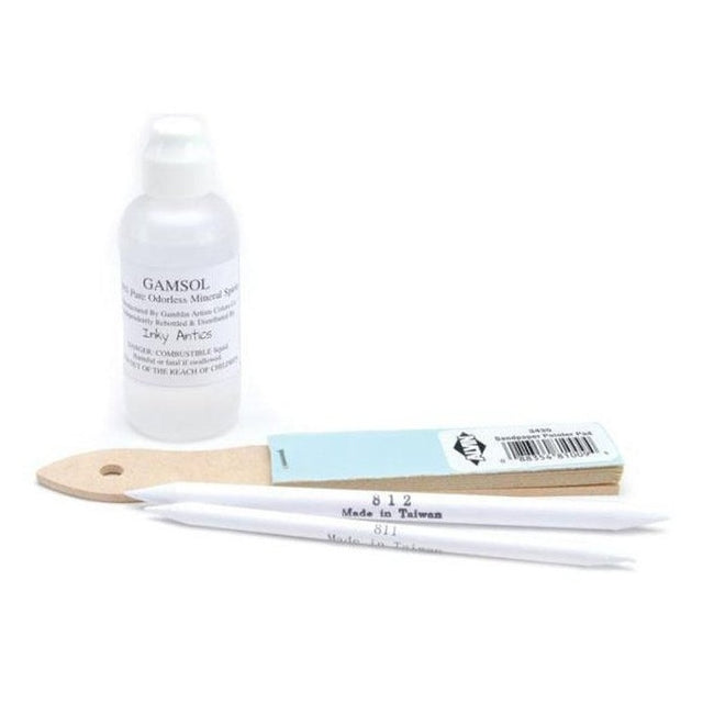 STAMPERS ANONYMOUS-Gamsol Odorless Mineral Spirits Kit. A blending medium for colored pencils! Artist-grade, odorless mineral spirits in a convenient, sponge-top dabber bottle that results in a pretty, almost watercolor look since it essentially melts the pencil lines and erases their grainy appearance. Simply color in a stamped image with colored pencils and apply Gamsol using the blending stumps. Note: this technique is for regular colored pencils, not watercolor pencils. This package contains one two ounce bottle of solution, two blending stumps and one sandpaper pad. Made in USA.