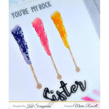 This Rock Candy layered stamp set is easy for all stampers, new or experienced! Each piece of rock candy comes with four layers and there is a candy stick with two layers. The sentiments are "mix and match" so you can use them together or separately. They include: