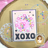 This layered heart doily is perfect for not just valentine cards but all occasion cards year round! It features a full doily bottom layer and a top layer with a heart border. There are so many ways to use this die set, you can inlay the hearts in the doily border with different colored or patterned papers to make it your own. You can also use the doily as a backdrop for your favorite sentiment or stamped image.