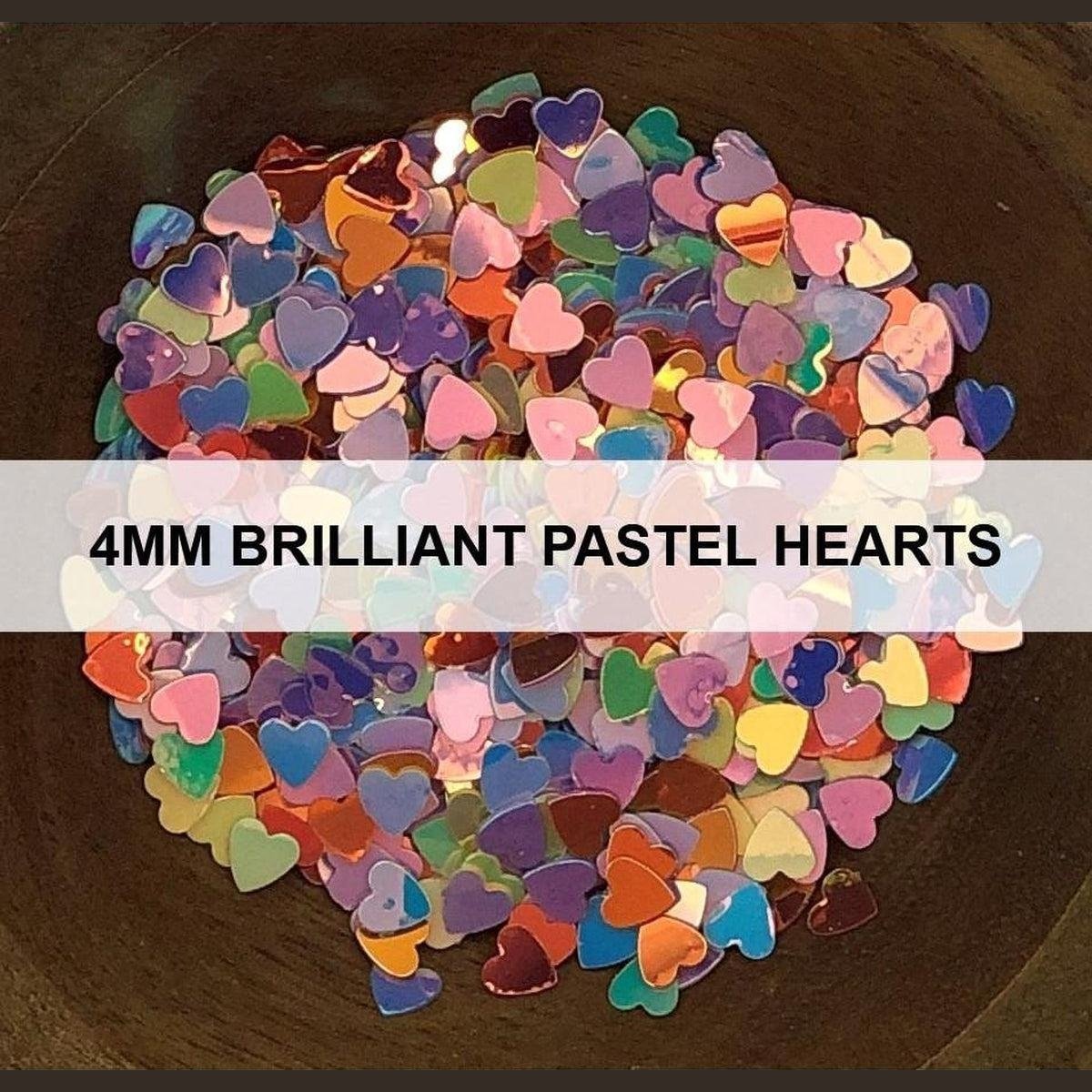 Indulge in the dazzling brilliance of 4mm Brilliant Pastel Hearts - Sequins, with approximately 1 1/2 teaspoons of sequins adorably packaged in a clear re-sealable plastic bag.