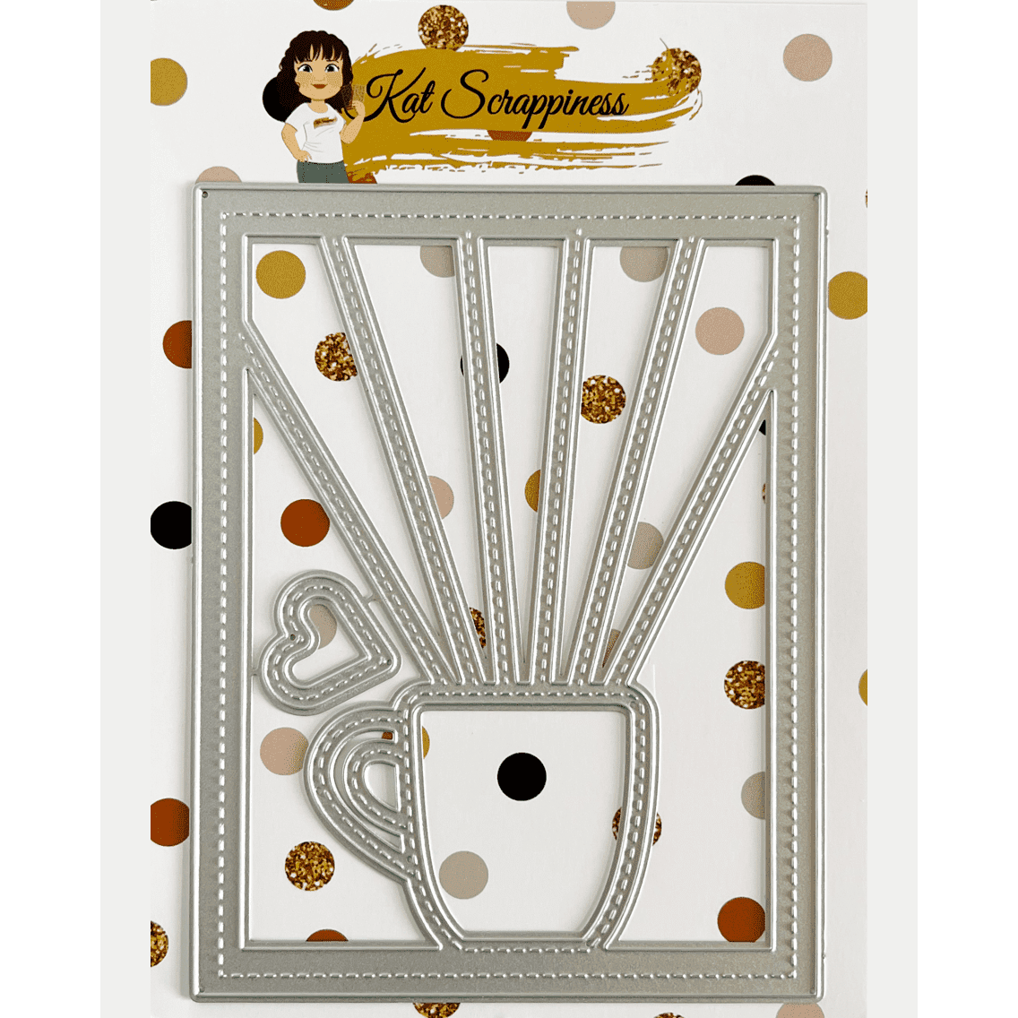 This really cool background die measures 4.25 x 5.5 and is perfect for greeting cards, mixed media and scrapbooking projects. It features two dies, a background die and a stitched heart die. The background die is stitched and will cut out a coffee cup shape as well as rays coming out of the coffee.
