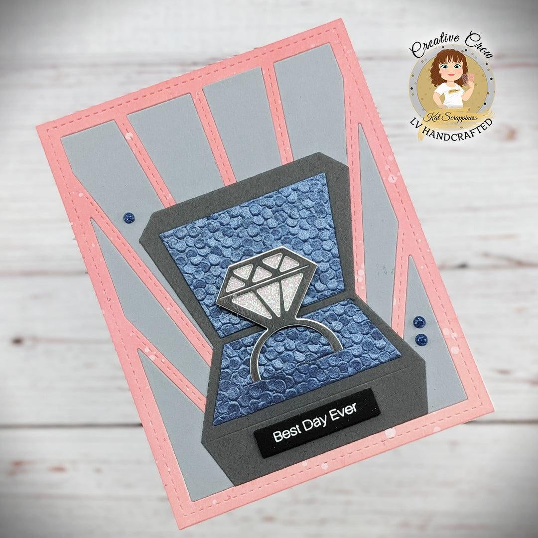 Say Yes is the a one of a kind die set! Every girl dreams of someday receiving an engagement ring from their true love and now you can create your very own using our new die set. This set includes four dies - Ring box with an inside layer and engagement ring. The box looks awesome cut from flocked cardstock which looks just like a velvet ring box. Or you can use specialty cardstock to make it your own!