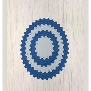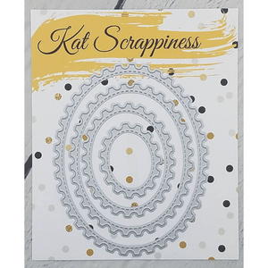 Kat Scrappiness Dies are made of superior steel and are compatible with all die cutting machines on the market. This die was designed exclusively for Kat Scrappiness. © 2024 Kat Scrappiness, Inc. These dies will cut perfect ovals with stitch lines and a postage stamp edge around the outside of the shape and are designed to fit an A2 sized card perfectly!