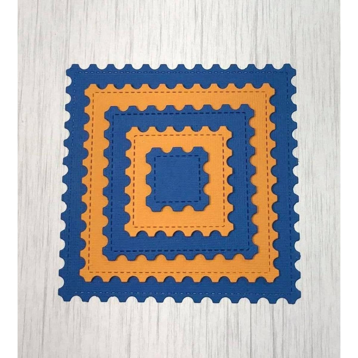 Kat Scrappiness Dies are made of superior steel and are compatible with all die cutting machines on the market. This die was designed exclusively for Kat Scrappiness. © 2024 Kat Scrappiness, Inc. These dies will cut squares with stitch lines and a postage stamp edge around the outside of the shape. They are designed to fit an A2 sized card perfectly!